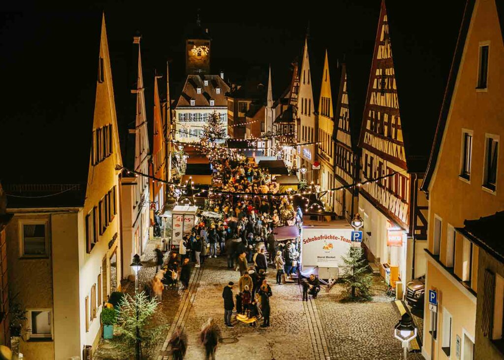 Eine ganze (Alt-)Stadt im Vorweihnachtsfieber erleben Besucher im adventlichen Rothenburg. Der Rothenburger Reiterlesmarkt öffnet ab dem 21.11. bis zum 23.12.2025 (23.11. geschlossen) seine Pforten. Geöffnet ist der Markt Sonntag bis Donnerstag von 11 bis 19 Uhr, Freitag und Samstag bis 20 Uhr. In insgesamt 60 Buden finden die Besucher Kulinarisches: selbstgemachte Bratwürste oder den regionaltypischen weißen Glühwein sowie Geschenkideen regionaler Anbieter – weltberühmt und gleichzeitig gemütlich-familiär, dies stellt beim Reiterlesmarkt keinen Widerspruch dar.